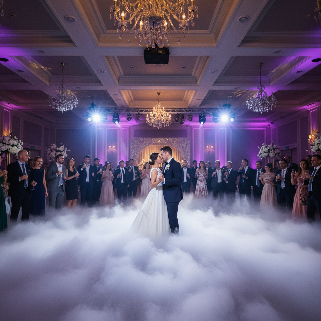 SOS DJ propose un dispositif complet et haut de gamme incluant une sono puissante, des éclairages dynamiques et une machine dernière génération pour créer un effet de fumée lourde spectaculaire. Ce nuage dense et bas au sol sublime visuellement votre première danse et les moments forts de votre soirée.