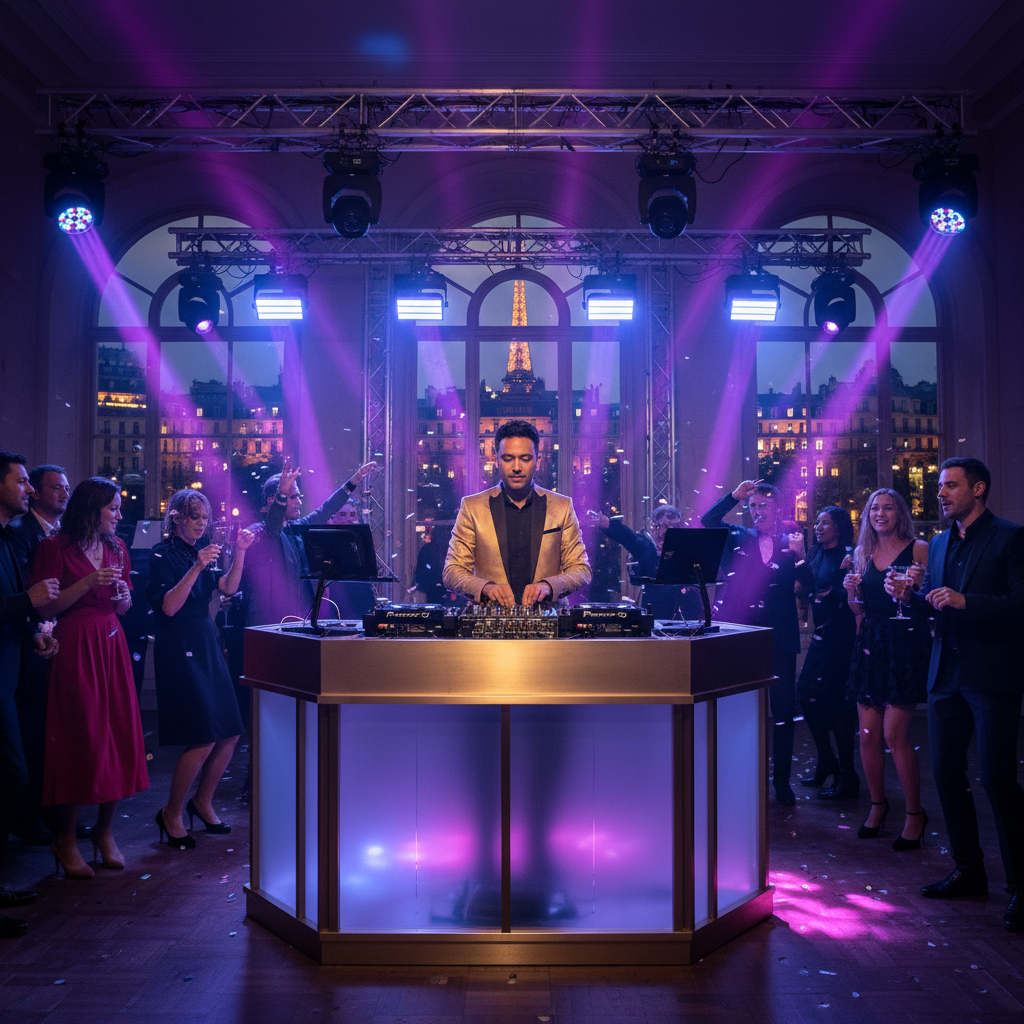 Nous disposons d’un matériel professionnel complet : platines, table de mixage, sonorisation adaptée à chaque espace, éclairages LED modernes, et diffusion vidéo sur demande pour une expérience immersive.