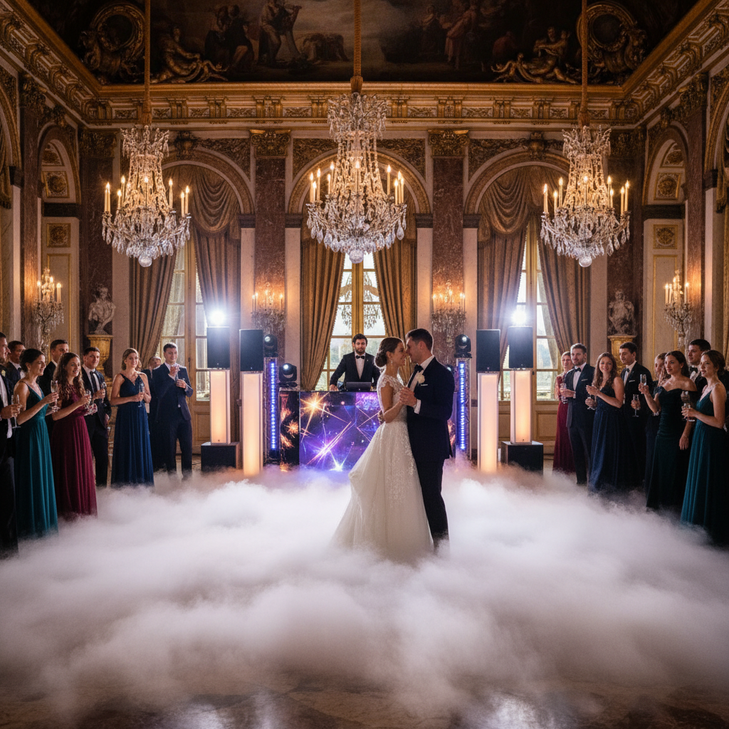 Chez SOS DJ, spécialiste en fumée lourde pour mariage à Versailles et sa région, nous créons une ouverture de bal magique pour transformer votre journée en un véritable conte de fées. Grâce à un tapis de fumée dense et basse, l’effet visuel impressionnant sublime la première danse des mariés dans des lieux emblématiques comme le Château de Versailles ou le quartier Saint-Louis.
